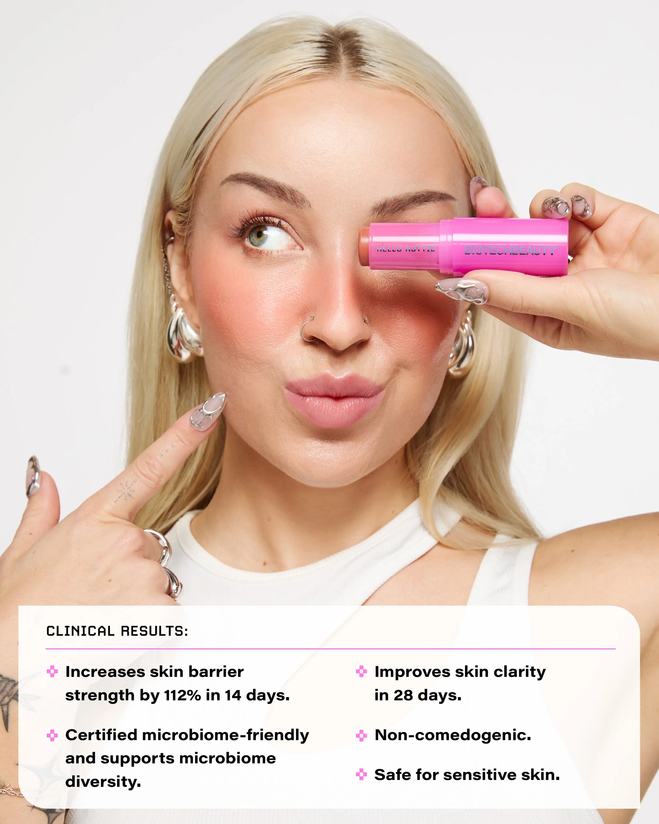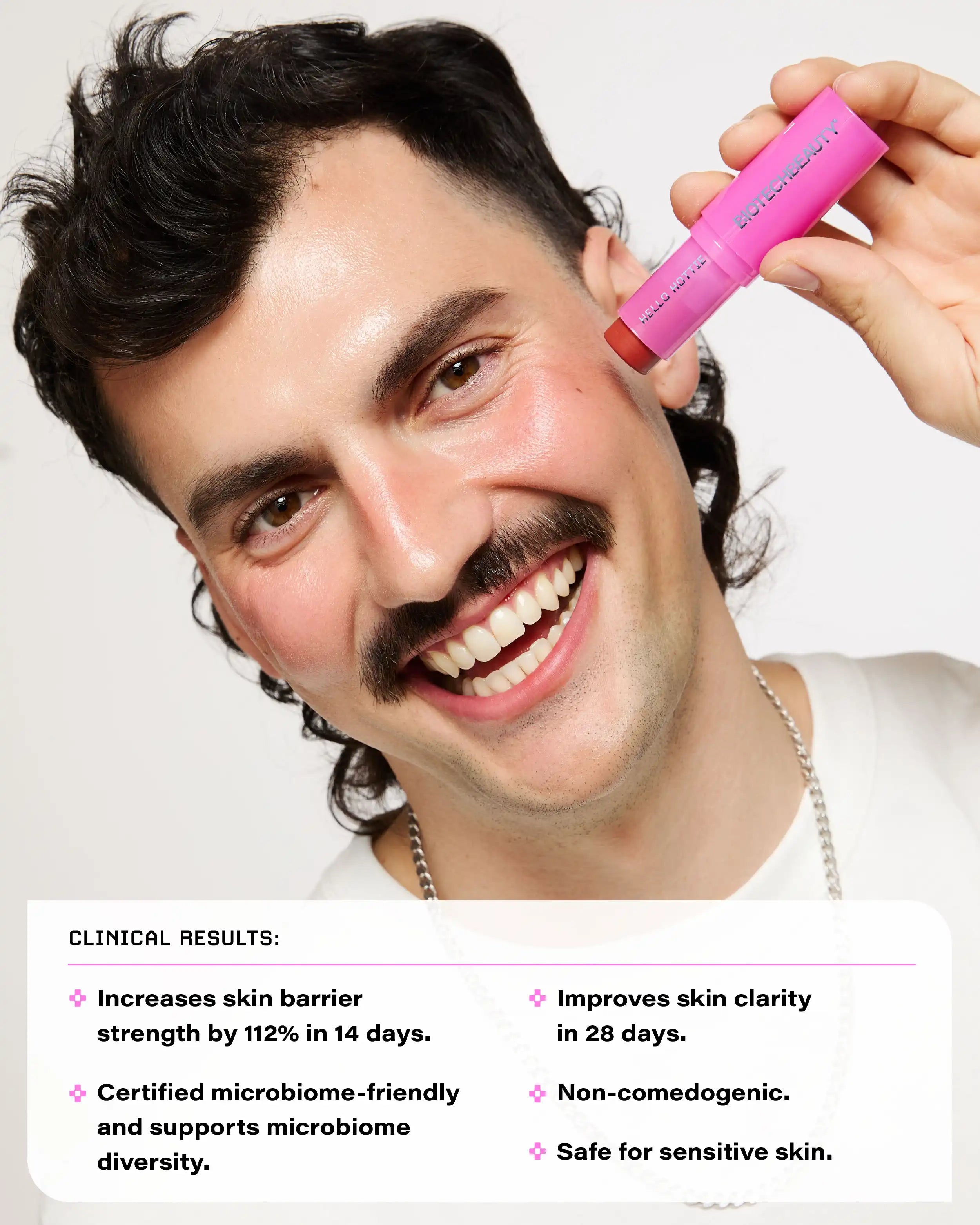 - Improves skin clarity. Based on a comedogenicity study in which participants experienced a 30% reduction in the appearance of comedones after 28 days of using BiomeBlush®.