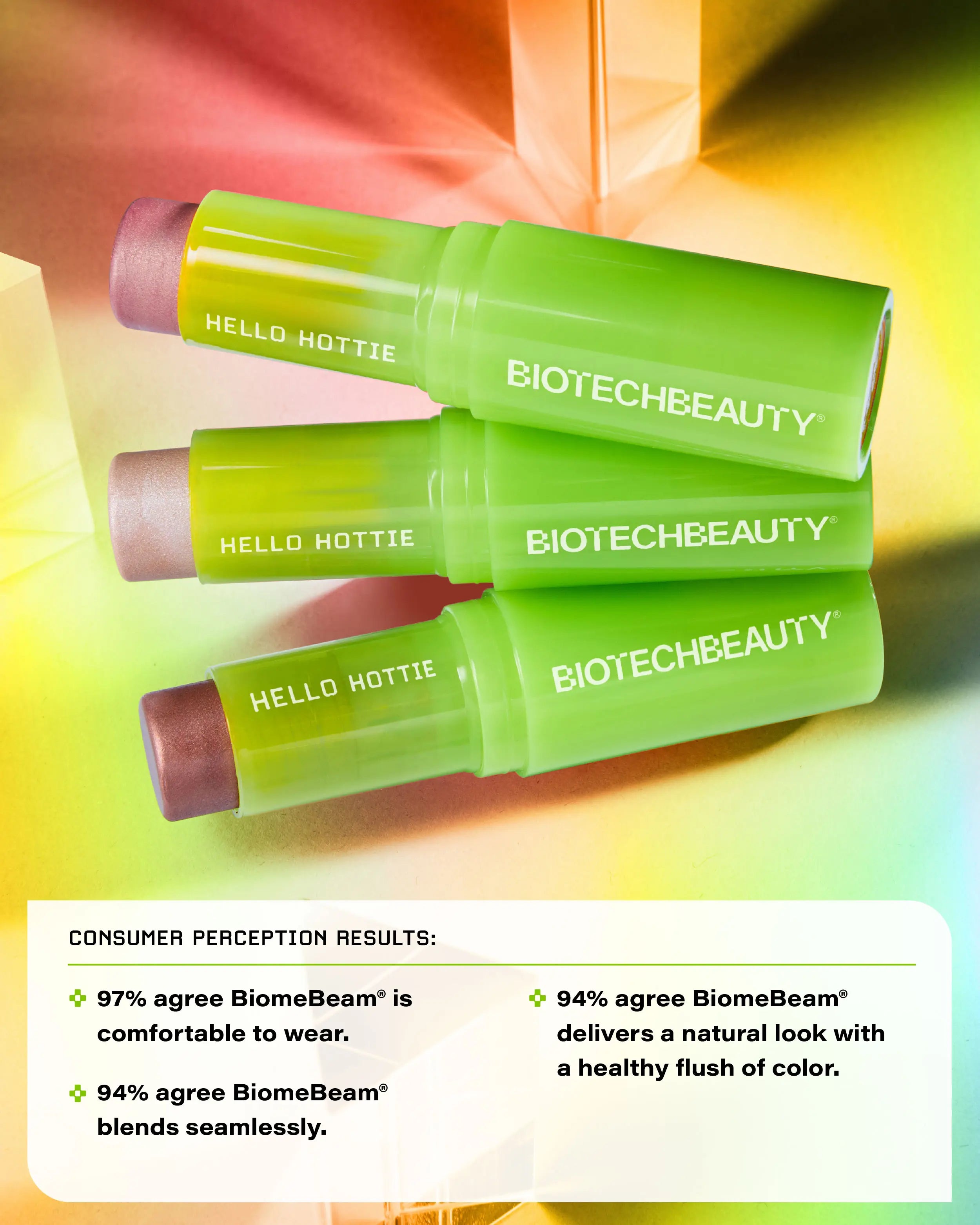 - 94% agree BiomeBeam® delivers a natural look with a healthy flush of color.